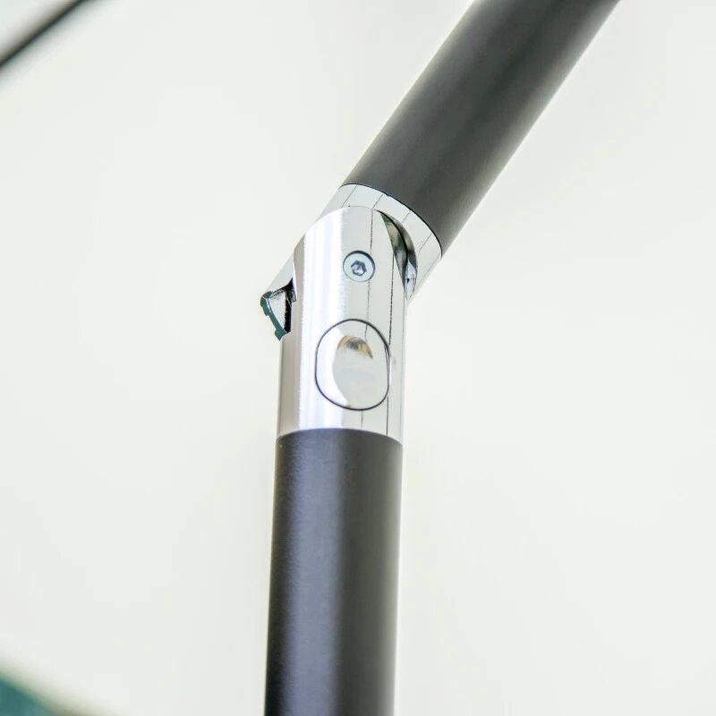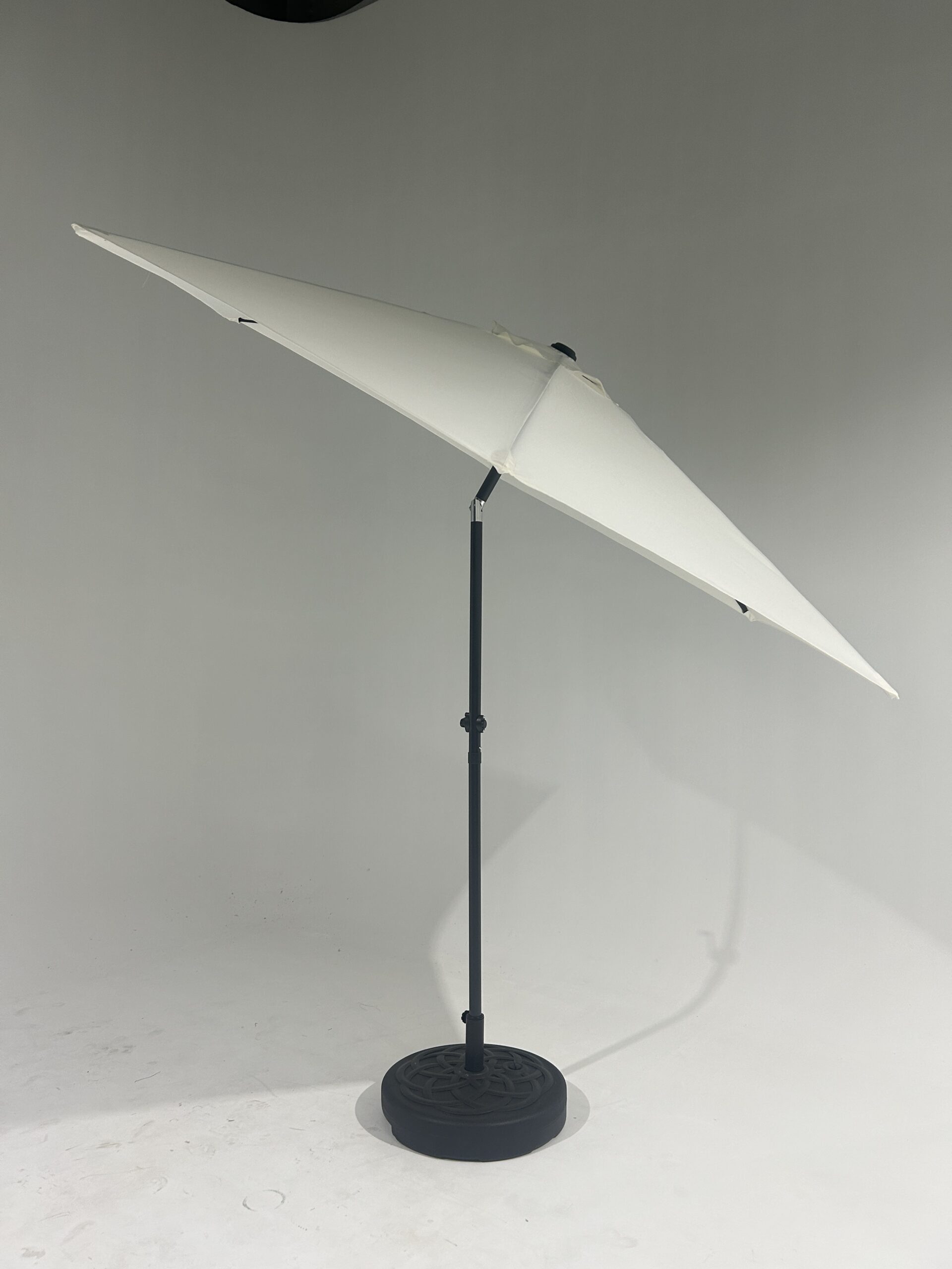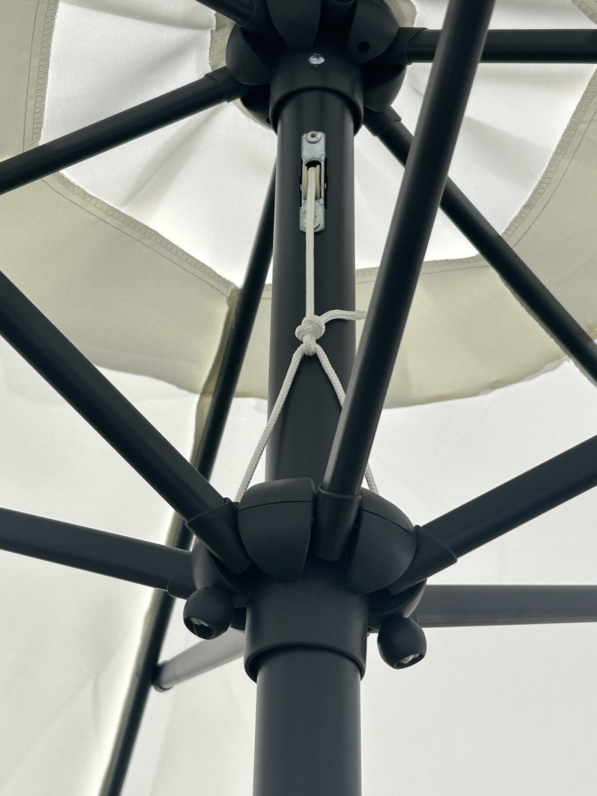 the pole size is 38mm witch is a standard size that will fit in TEAK garden furniture sets and rattan the pole is made from powder coated steel with a crank handle built in that makes it easy to wind up or down