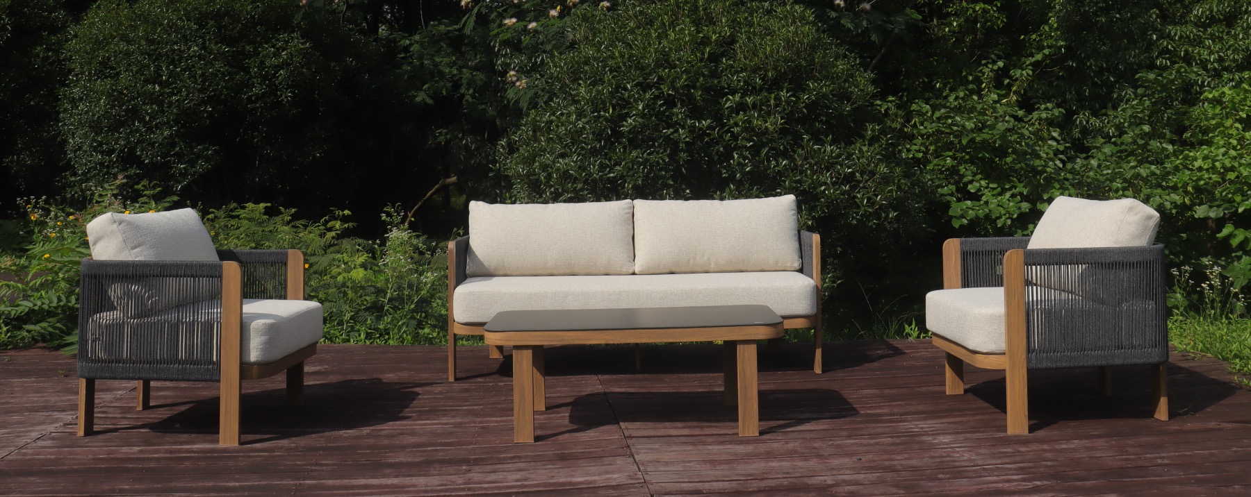 Each piece features handwoven rope sides, adding a touch of texture and sophistication to the clean, modern lines of the aluminium frame. The rope is UV-resistant and durable, combining natural style with outdoor performance.