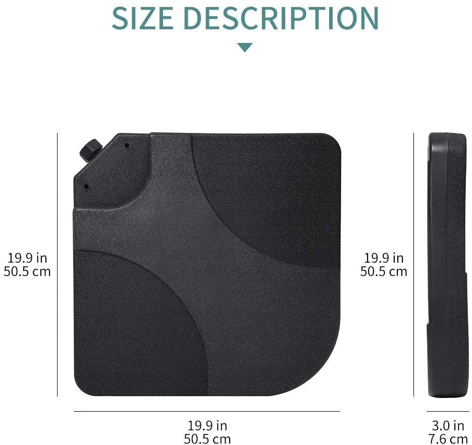 This heavy-duty parasol base consists of 4 interlocking square pieces, each measuring 50 x 50 cm and 7.5 cm thick. Once filled, the complete set offers a solid foundation, keeping your cantilever umbrella firmly in place while you enjoy shade and comfort outdoors.